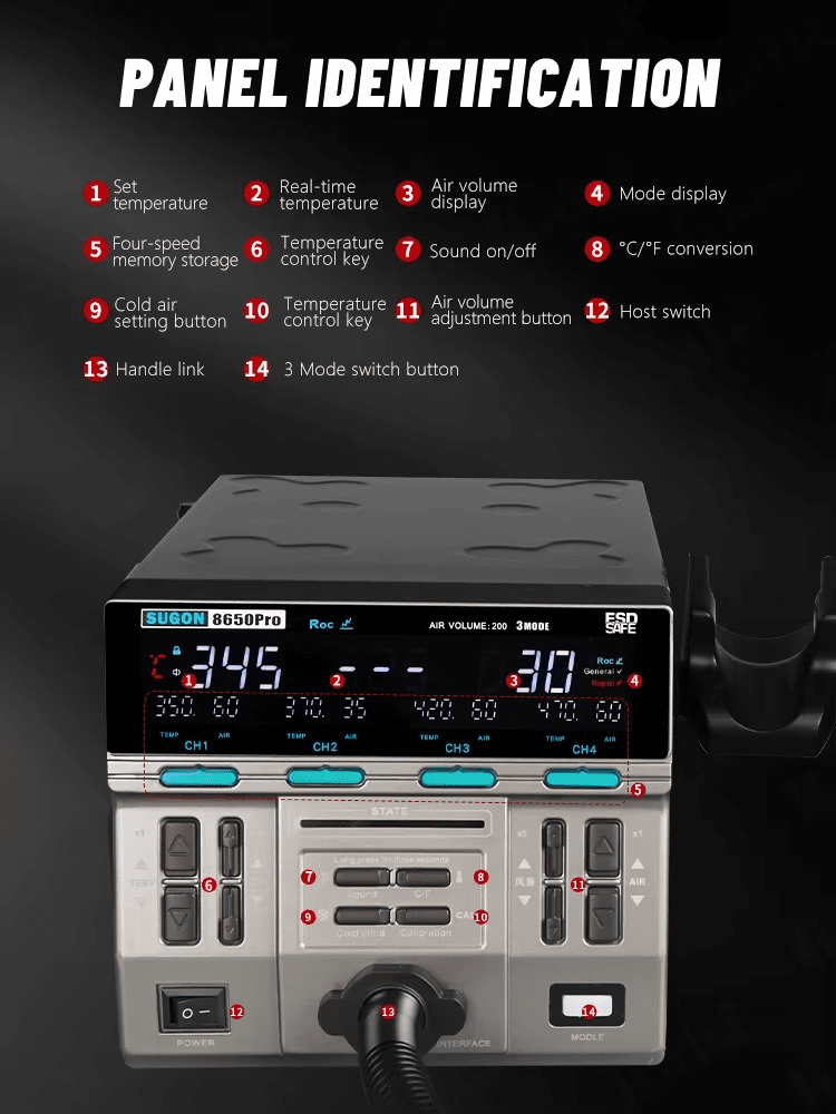 High-power hot air stations often mean high noise. The SUGON 8650Pro delivers 1300W performance with minimised acoustic output.