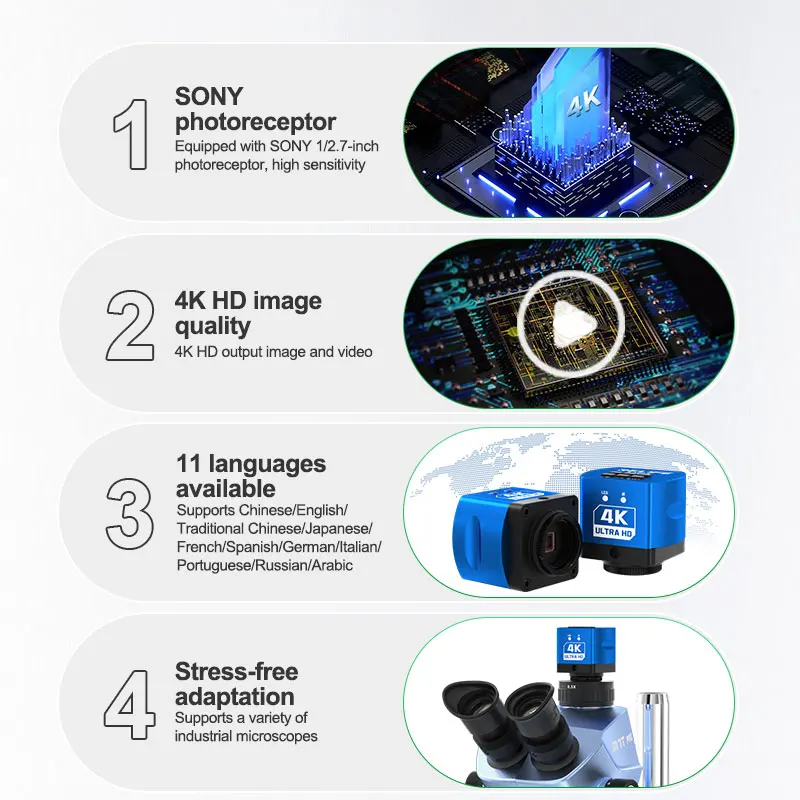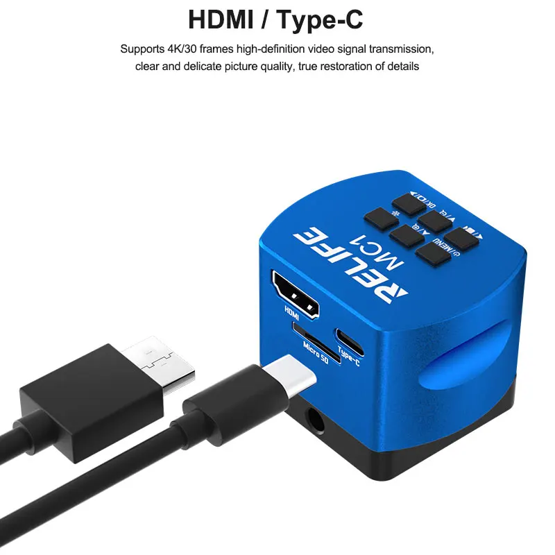 The 1/2.7-inch CMOS sensor feeds three simultaneous outputs. HDMI delivers 4K at 30fps or 1080p at 60fps directly to any monitor. USB-C connects to your PC for capture software and analysis. The TF card slot lets you record without a computer. Choose the workflow that fits your bench setup.