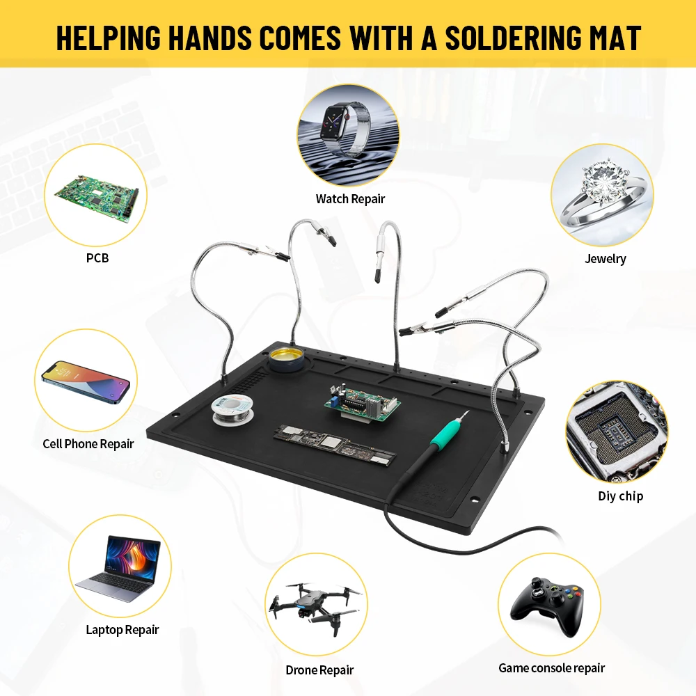 Hold components steady and protect your workbench with a complete soldering workstation featuring 5 flexible arms and heat-resistant mat.