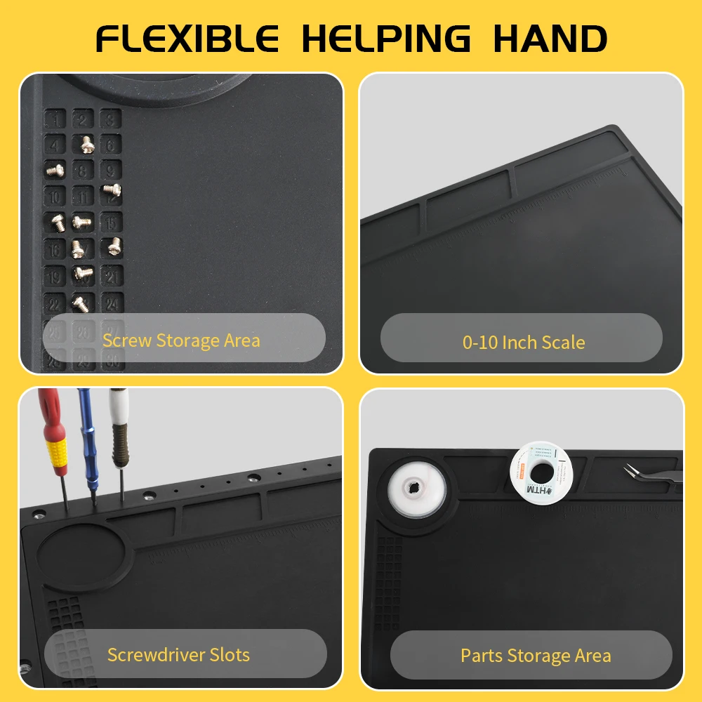 The 39cm × 28cm silicone mat handles temperatures up to 500°C—hot enough for any soldering or hot air rework task. Work directly on the surface without damage.