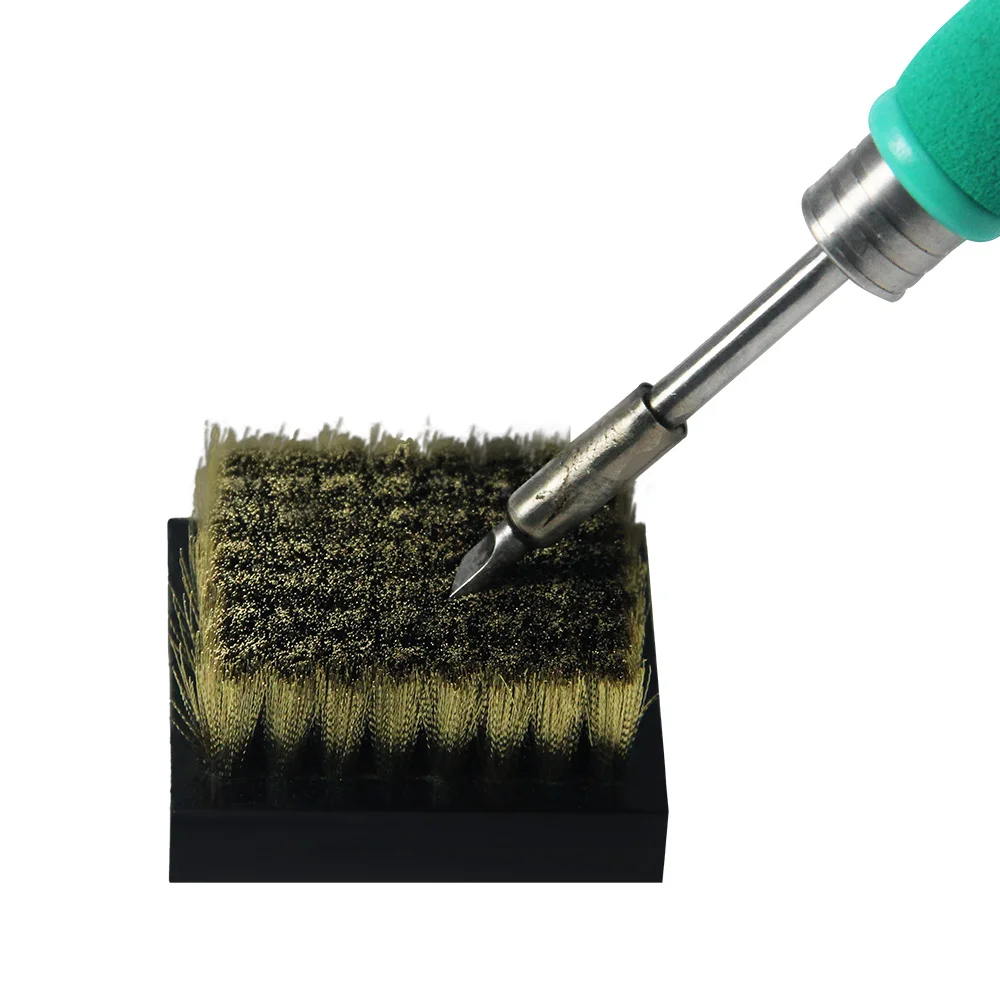 Wet sponges cool down your tip and slow your work. This copper wire brush cleaner removes residue without dropping your tip temperature—so you keep soldering without waiting for reheat.
